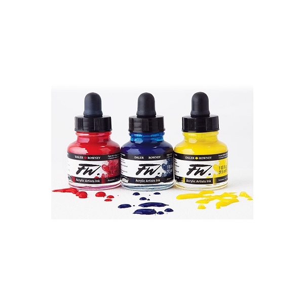DALER-ROWNEY. INCHIOSTRO ACRILICO FW. E' UN INCHIOSTRO CHE SI BASA SU PIGMENTI RESISTENTI ALL'ACQUA. FW PUO ESSERE APPLICATO PRATICAMENTE SU TUTTI I SUPPORTI, COME CARTA, TELA, LEGNO, VETRO, METALLO ECC. DISPONIBILI IN FLACONI DI VETRO DA 29,5 ml. CON TAPPO CONTAGOCCE. GAMMA COMPLETA DI 45 COLORI.