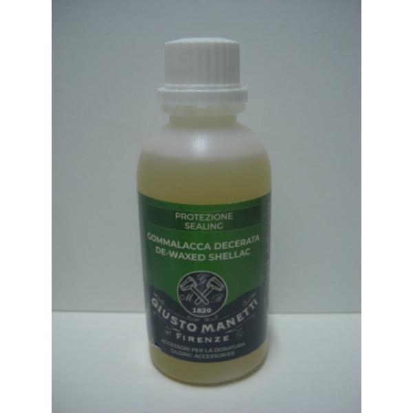 Gommalacca decerata De-waxed shellac e' in soluzione pronta all'uso, indicata come protettivo leggero e come lucidante per le dorature a foglia, sia in metallo prezioso che imitazione. A differenza della gommalacca shellac la decerata ha una gradazione piu chiara. Disonibile in flaconi da 125ml e 250ml.
