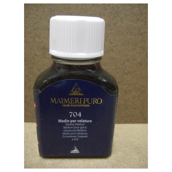 Maimeri puro medio per velature, fluido denso, composto da resina alchidica, non ingiallente e siccativo in minima parte per diminuire il tempo di essiccazione dei colori. Dona brillantezza, trasparenza ed elasticita' eccezionali. Disponibile in flacone da 75 ml.