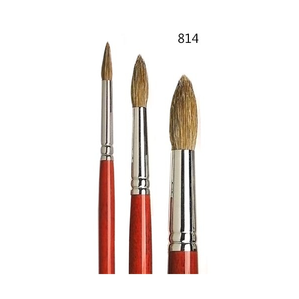 Pennello tondo, pelo bue chiaro. Ghiera in ottone nichelato. Manico lungo di legno verniciato rosso. Numerazione disponibile dal 3/0 al 26.